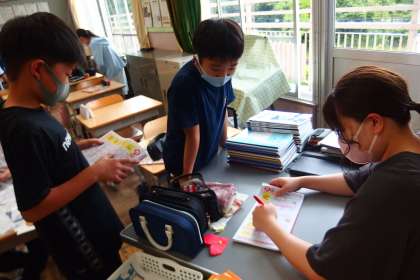 漢字の書き順テストに挑戦している5年生です。