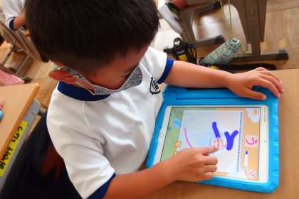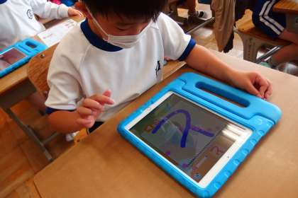 ひらがなの書き順をタブレットのアプリを利用して覚えているところです。