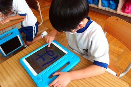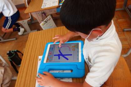 ひらがなの書き順をタブレットのアプリを利用して覚えているところです。