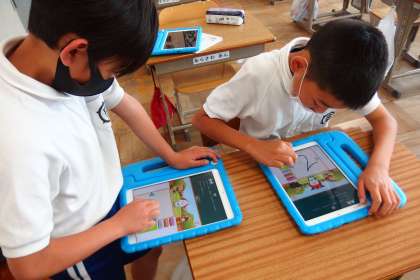 4年生がタブレットのアプリで復習をしています。