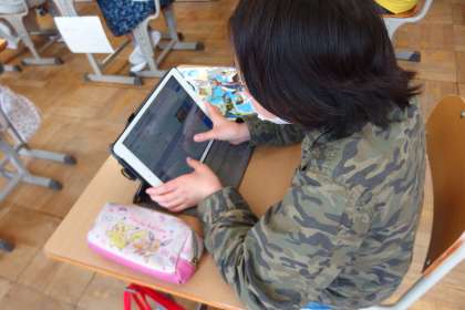6年生の英語の授業です。 タブレットの発表ノートで、ALTの先生に紹介する原稿を作成しています。