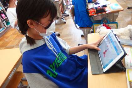 タブレットの発表ノートで、ALTの先生に紹介する原稿を作成しています。