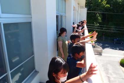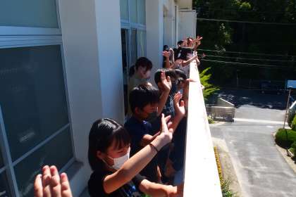 今日、2年生、3年生、6年生のささゆりの里への出発を、5年生が見送りしてくれました。