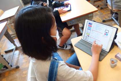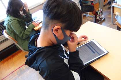 担任の先生から、学校のホームページからの閲覧の仕方を教えてもらい、5年生がタブレットで見ているところです。