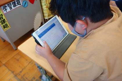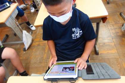 担任の先生から、学校のホームページからの閲覧の仕方を教えてもらい、5年生がタブレットで見ているところです。