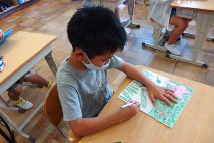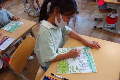 校外学習から帰ってきた後で、ささゆりの写生画の仕上げをしている3年生です。