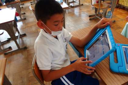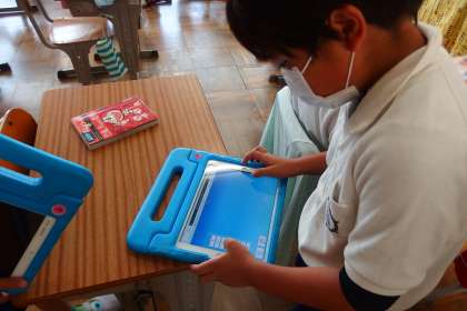 タブレットに健康観察を入力する4年生です。