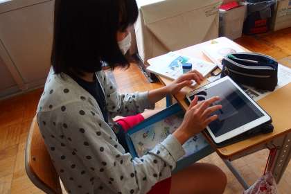 タブレットに健康観察を入力する6年生です。