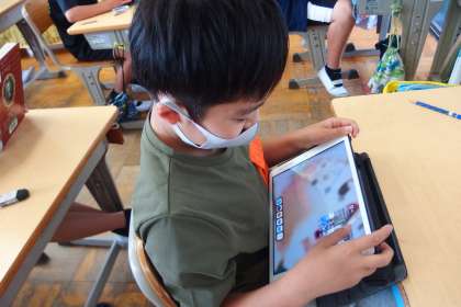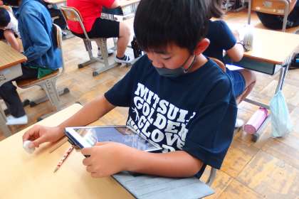 5年生の授業で、タブレットを使って知識の定着を図っているところです。