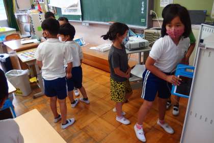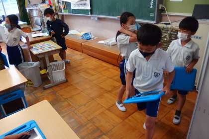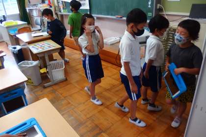 健康観察をするために保管庫からタブレットを取り出している2年生です。