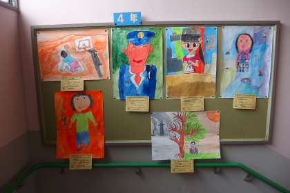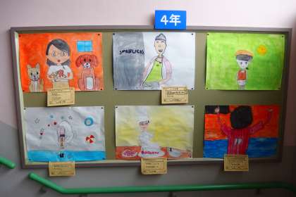 図書室階段の踊り場に4年生の図工の作品が掲示されていました。