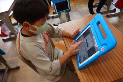 今朝の健康観察をタブレットに入力しているところです。