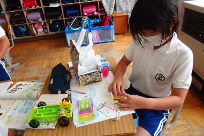電池の本数、歯車の向き、配線のつなぎ方、車輪とプロペラの変更などで、電気の持つ特徴や車体の動きの違いを学んでいきます。