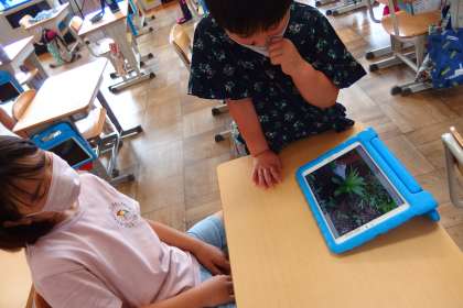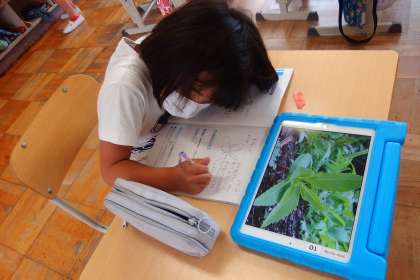 ホウセンカを育てている3年生。 タブレットで写真を撮って、生育状況を記録に残しています。
