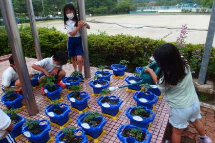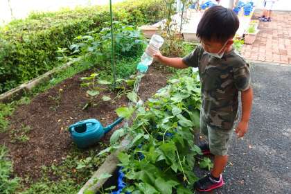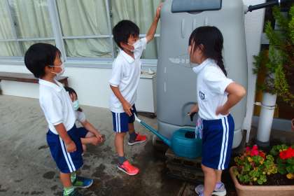 アサガオとミニトマトに水やりをしている1年生と2年生です。