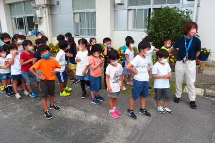 萩野小の1年生が到着しました。 下の写真が出迎えをする本校の1年生です。