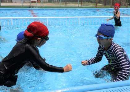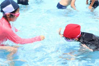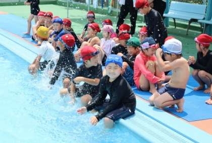 次は、一緒にプールに入りました。 水中じゃんけんや碁石し拾い競争などを楽しみました。