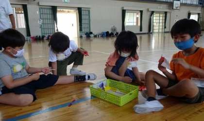 自分だけの飛行機ができあがったら名前を書いて準備完了です。 友達とも教えあって作りました。