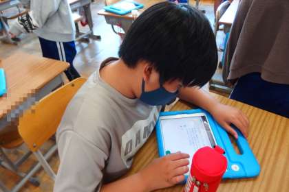 タブレットでデジタルドリル(Qubena)を使っている4年生です。