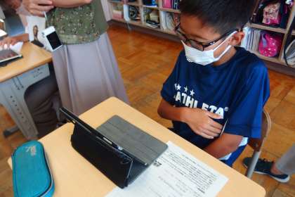 タブレットでデジタルドリル(Qubena)を使っている6年生です。