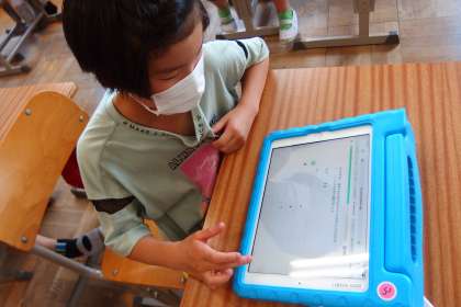 タブレットでデジタルドリル(Qubena)を使っている4年生です。