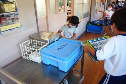 給食の配膳をする2年生です。