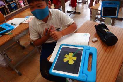 7月4日の東広瀬小学校(10) 公開日 2022/07/05 更新日 2022/07/05 活動の様子 4年生の理科の授業です。 栽培しているツルレイシ(ゴーヤ)をタブレットで撮影して、栽培日記をつけているところです。