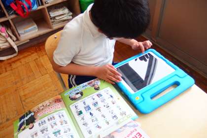 ALTの先生に発表する原稿を、タブレットの発表ノートで作っています。