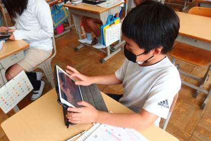 ALTの先生に発表するスピーチを、タブレットの発表ノートで作成しています。