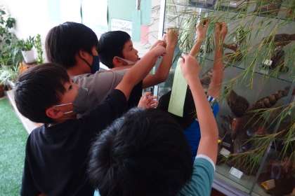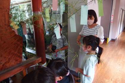 七夕飾りに願い事をつけているところです。