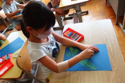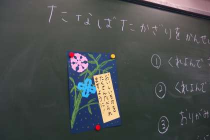 1年生の授業の様子です。 七夕飾りにつける願い事を書いています。