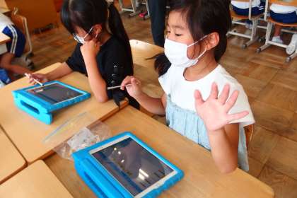 担任の先生が示したトピックに対して、タブレットに自分の考えを書き込んでいるところです。
