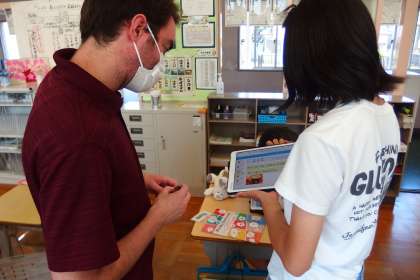 タブレットを見せながら、ALTの先生との会話に挑戦中です。