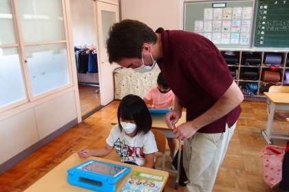 タブレットを見せながら、ALTの先生との会話に挑戦中です。