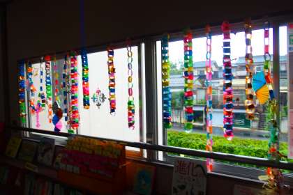 4年生の教室の前に、とてもきれいな七夕飾りがありました。