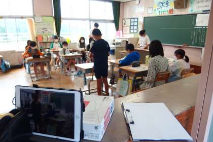 6年生の国語の授業です。 話し合いの様子をタブレットで動画撮影して、振り返りの材料とします。