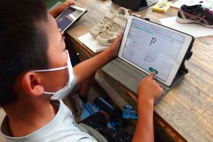 タブレットでqubena(デジタルドリル)に取り組む5年生です。