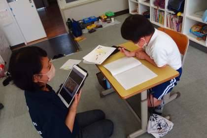 タブレットでの説明を聞きながら復習を進める4組の子です。