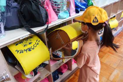 1年生の朝の様子です。 ランドセルをロッカーに入れるのもひと苦労です。