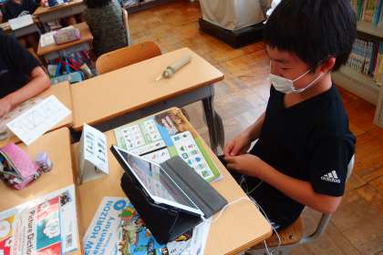 6年生の英語の授業です。 タブレットのqubena(デジタルドリル)で復習をしています。