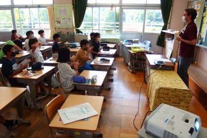 5年生の英語の授業です。 ALTの先生とデジタル教科書の英語の歌を歌っているところです。