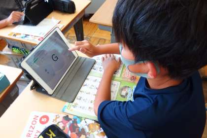 5年生の英語の授業です。 Qubena(デジタルドリル)でライティングの復習をしています。