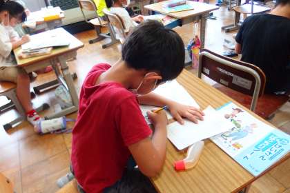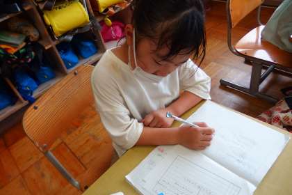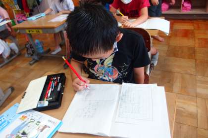 朝、連絡帳の記入をする1年生です。 だいぶ書くのがはやくなってきました。