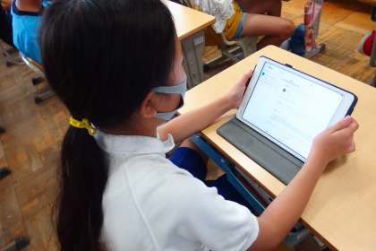 タブレットでデジタルドリル(Qubena)を使う5年生です。