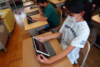 タブレットのアプリ microsoft Teams を使って、オンライン出校日の練習(ビデオ会議)をする5年生です。