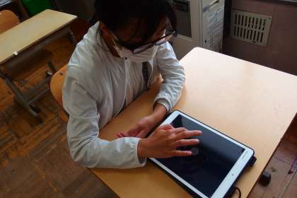 タブレットのアプリ microsoft Teams を使って、オンライン出校日の練習(ビデオ会議)をする5年生です。