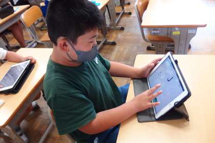 すきま時間を使って、タブレットのQubena(デジタルドリル)で復習ををする5年生です。