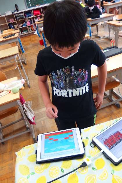 すきま時間を使って、タブレットのアプリで復習をする6年生です。
