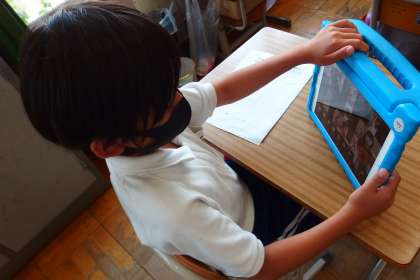 オンライン出校日の方法をタブレットで確認している4年生です。