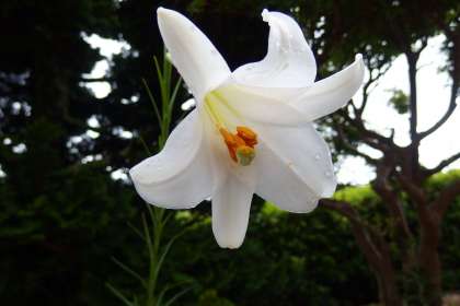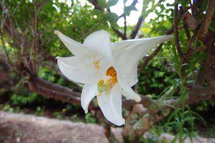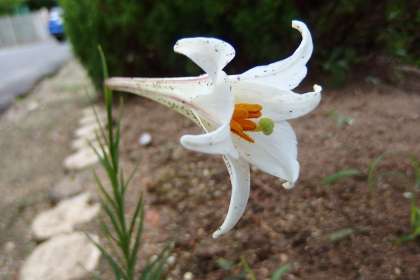 学校の敷地内では、いろいろな場所で順番にユリが咲いています。